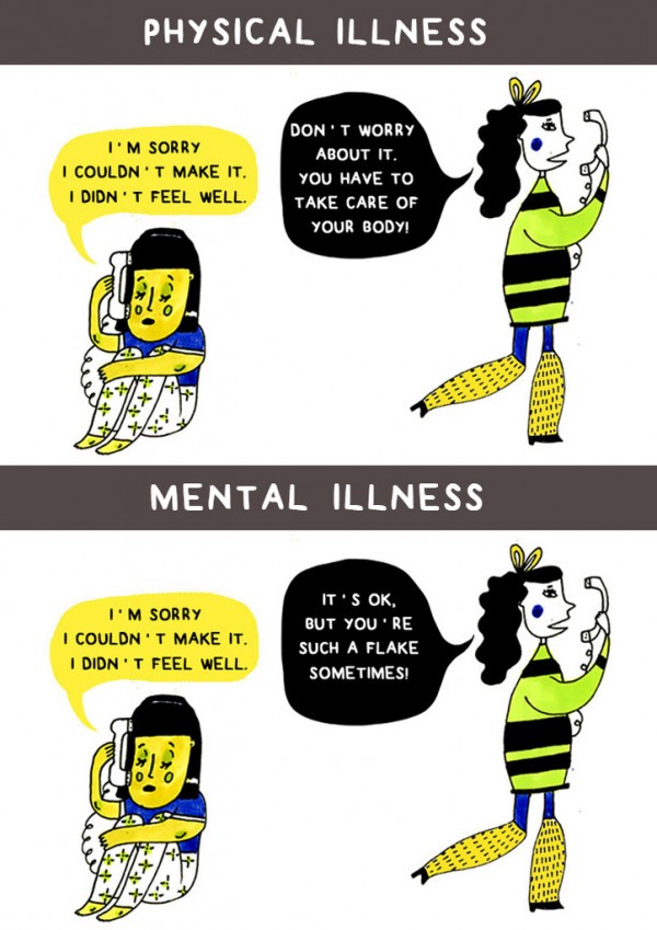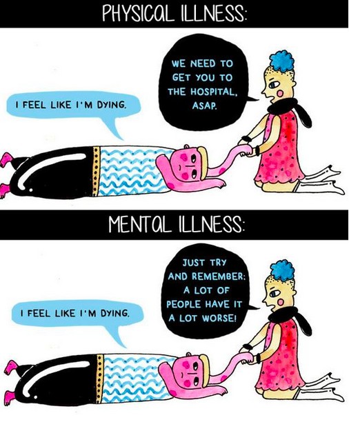 Ak sa človek cíti zle fyzicky, ľudia sa hneď zaujímajú o jeho zdravotný stav, ponúkajú mu odvoz do nemocnice, odvoz na vyšetrenie a podobne. Ale ak sa človek cíti zle psychicky, povedia mu, že ostatní to majú stokrát horšie a neurobia s tým nič.